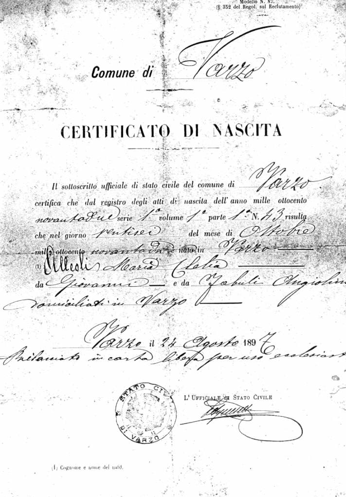 Originale certificato di nascita di Alleoli Maria del 26/10/1892 in Varzo